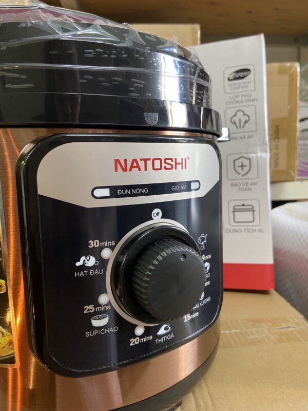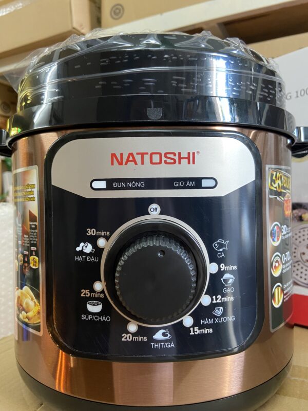 Natoshi là thương hiệu chuyên đồ bếp, đồ gia dụng chất lượng giá bình dân. Các sản phẩm được sản xuất theo công nghệ Nhật. Hãng khá quen thuộc với các sản phẩm nồi áp suất, nồi hấp điện, máy sấy bát đĩa… Nồi áp suất điện Natoshi NS-07 có thể chế biến hầu hết các món ăn cho gia đình. Có 9 chức năng được lập trình sẵn từ đó bạn có thể chế biến các món ăn phù hợp. Bạn có thể nấu cơm, cháo, soup, nấu canh, hầm các loại thực phẩm, hấp, nấu… cới chiếc nồi đa năng này.